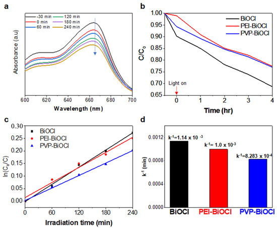 The photocatalytic properties of the BiOCl nanoplates were estimated for the decomposition of organic pollutants under visible light irradiation. To evaluate the photocatalytic performance of BiOCl, methylene blue (MB) was chosen as the organic pollutant. The photolysis process was investigated by checking the intensity of the major absorption peak at 668 nm associated with MB. The photocatalyst (BiOCl, PVP-stabilized BiOCl, or PEI-stabilized BiOCl) was added to a solution of MB and the intensity of the MB absorption peak according to the photocatalytic reaction rapidly decreased, and the results showed that the MB molecules were degraded effectively under visible light illumination in the existence of BiOCl nanoplates. (Figure 3a and Figure S4). Figure 3b displays the concentration of MB (C) normalized against the concentration at the start of the reaction (C0) for the photocatalytic reaction with the nanoplates. A plot of the normalized concentration on a logarithmic scale versus the reaction time is shown in Figure 3c, demonstrating that the reaction of MB degradation has first order kinetics, as in expressed in Equations (1) and (2):