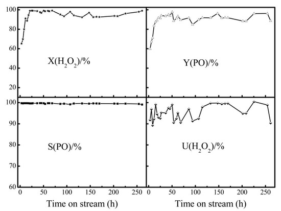 The catalytic stability of E-HPTS-1-8 has been investigated in the fixed bed reactor (Figure 4). At the initial stage of the reaction, fewer than 50 h, the conversion of H2O2 and yield of PO increased gradually. From 50 to 220 h, the catalytic performance is basically stable.
