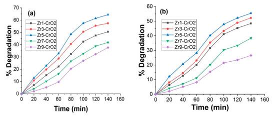 2.2.3. MB and MO Percent Photo Catalytic Degradation Curve of Zr-doped CrO2 as Function of time