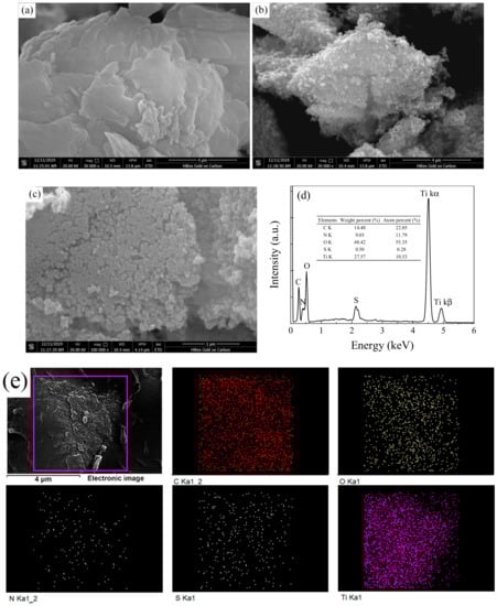 The microscopic morphologies of the grinded wool pallets before and after treatment with TBT under hydrothermal condition were observed on a FESEM instrument. The element mapping of the cross-section of WT pallets was conducted on an EDX equipment coupled to the FESEM. The images were shown in Figure 1. It was clear that after 30 min of vibration grinding, the fibrous wools were converted into small flakes without porous structure combined with a few granular substances in the range of sub-micrometer or micrometer sizes. These grinded small wool particles were piled up to form into the wool pallets having larger grain sizes, while still having both increased specific surface area and exposed more active groups []. The surfaces of the as-grinded wool pallets were very clean without any attachments (Figure 1a). After hydrothermal treatment with TBT, they were completely covered by a large number of agglomerates dotted with some cracks and pores (Figure 1b). The high-resolution FESEM image indicated that these agglomerates were composed of nano-scaled particles (Figure 1c). The irregular topography [] and large surface area resulted from pores [] were helpful for the WT powders to absorb and scatter the incident light. The EDX spectrum of the WT powders confirmed the presence of C, O, N, S, and Ti elements. The atom percentage of the Ti element was 10.53% (Figure 1d). The element mapping images of the cross-section of WT powders suggested that the C, O, N, S, and Ti elements were homogeneously distributed in the whole section (Figure 1e).