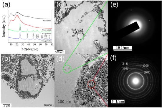 (a) XRD patterns of wool pallets before and after loading TiO2; (b–d) TEM images of the cross-section of WT powders and the (e,f) corresponding SAED patterns
