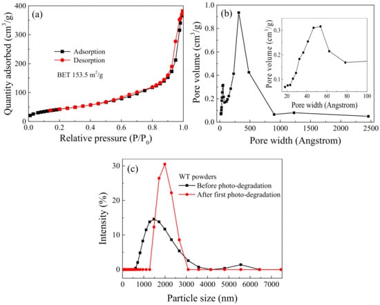 Nitrogen adsorption–desorption isotherms (a), pore size distribution curve (b) of the WT powders; the particle size distribution curves (c) of the WT powders before and after one photodegradation cycle.