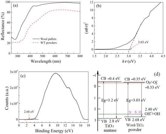 The diffuse reflection spectra of wool pallets before and after loading TiO2 were shown in Figure 4a. In comparison with wool pallets, the light absorption capability of the WT powders was significantly improved in both UV and visible light regions. The absorption edge was red-shifted due to the electron transitions from VB to CB (O2p→Ti3d) of TiO2 deposited on wool pallets []. The average reflectance was reduced from 50.9% to 29.2% in UV region and from 96.5% to 77.7% in visible light region. The band-gap energy was calculated on the basis of Kubelka-Munk equation []. As shown in Figure 4b, the direct band-gap was considered for the WT powders, and the band-gap energy (Eg) was estimated as 2.98 eV from the intercept of the tangent to the x-axis by extrapolating the plot of (αhv)2 versus the photon energy (hv). In comparison with anatase phase TiO2 [], the band-gap of the WT powders decreased from 3.2 to 3.03 eV because of the incorporation of N, S, and O elements of wool keratin with TiO2 nanoparticles to form N-, S-, and C-doped TiO2 nanoparticles.