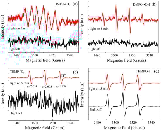 EPR spectra of (a) •O2−, (b) •OH, (c) 1O2, and (d) h+ for the WT powders under visible light irradiation.