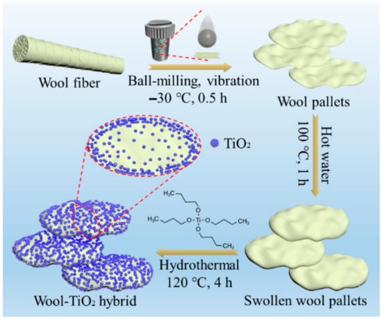 The technical route for producing the WT powders was shown in Figure 8. The wool fibers were first degreased with petroleum ether according to the Soxhlet method [], and then vibration-assisted ground using stainless steel balls under lyophilization condition to avoid thermal degradation of wool keratins. Based on the modified hydrothermal method [], the as-prepared wool pallets were swollen in hot water and then immobilized with TiO2 nanoparticles using TBT as the precursor. Thus, the micrometer-sized core–shell WT powders having special hybrid composite structure as well as greater reactivity and larger surface area were fabricated.