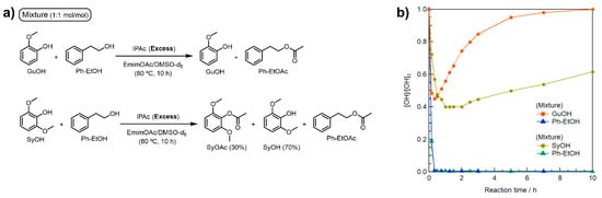 (a) Schematic representation of model reactions in EmimOAc/DMSO-d6: transesterification of equimolar mixtures of GuOH or SyOH with Ph–EtOH using IPAc as an acyl donor. (b) Effect of mono- or di-OMe groups at the o-positions of Ar–OH groups on the transesterification of mixtures of GuOH or SyOH with Ph–EtOH (0.38 mol L−1 each), excess IPAc (1.14 mol L−1), and EmimOAc (3.8 mol L−1) for 10 h at 80 °C determined as changes in relative contents by in situ 1H NMR in DMSO-d6.