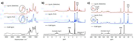 (a) ATR-mode FT-IR, (b) 1H NMR, and (c) 13C NMR spectra of Lig-Ac (Selective), Lig-Ac (Full), and Kraft lignin.