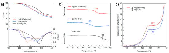 (a) TG-DTG and (b) DSC curves of Lig-Ac (Selective), Lig-Ac (Full), and Kraft lignin and (c) thermal flow curves of the acetyl derivatives expressed as displacement of a piston in a capillary rheometer.