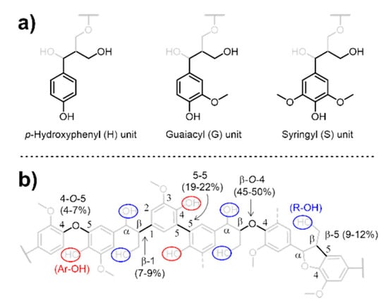 Structural representation of (a) aromatic repeating units and (b) dominant ether and carbon–carbon linkages in lignin with R–OH and Ar–OH groups.