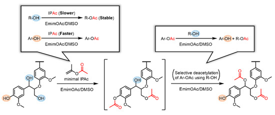 The model experiment (Figure 2) demonstrated that the use of excess EmimOAc enabled the complete deacetylation of Ar–OAc groups, even after all R–OH groups were acetylated. However, to increase the reusability of EmimOAc, another proton source should be used instead. Water can act as an optimal proton source in terms of greenness and cost-effectiveness, but excess water would significantly hydrate EmimOAc and interfere with its excellent catalytic activity for R–OH acetylation. Therefore, this series of reactions—acetylation of R–/Ar–OH groups with IPAc and subsequent selective deacetylation of Ar–OAc groups with water—was divided into two steps, and the added amount of water in the second step was adjusted to 2 Equations/[Ar–OH] to appropriately promote Ar–OAc deacetylation.
