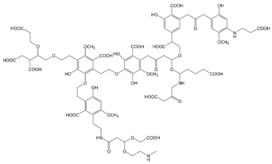 The fate of dead plants in nature is their degradation by microorganisms, whose metabolism induces the transformation of the constituted lignocellulose into the so-called humic substances (HS) [114]. Such substances regulate the global carbon and nitrogen cycles, act as nutrients/fertilizers and take part to soil and water depollution from xenobiotics by multiple mechanisms, i.e., redox reactions, sorption, complexation or photosensitization (if light-activated) [114]. HS persistency in the natural environment derives from the preservation of lignin-like structure, originated by LCB, that confer a high recalcitrance to enzymatic attack [115,116]. In general, HS chemical composition is characterized by aliphatic chains substituted by aromatic rings and multiple functionalities (carboxylic, phenolic, alcoholic, quinone, amino and amido groups), that represent the memory of the initial bio-organic matter (see Figure 2) [117,118]. Three are the fractions of humic substances, distinguished on the basis of water solubility and oxygen content: fulvic acids (FAs), soluble in water under all pH conditions, humic acids (HAs), insoluble in acidic water (pH < 2) but soluble at higher pH values and humin, insoluble in water at any pH value [114].
