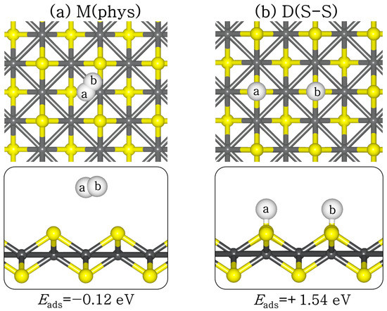 Lowest-energy adsorption structures of (a) molecular (M) and (b) dissociated (D) H2 on perfect FeS (001) surface, in top (top) and side (down) views. (Atomic colour: Fe = grey, S = yellow, H = white.)