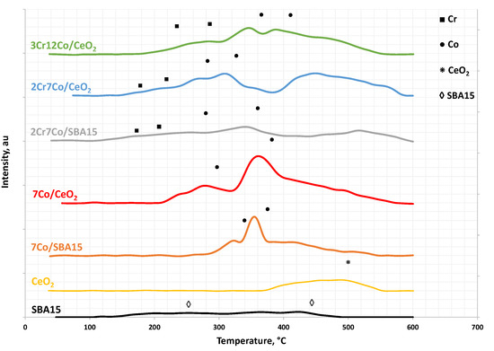 Figure 1 shows the H2 consumption trends as function of temperature; not appreciable H2 consumption was detected for SBA-15, while CeO2 exhibits a characteristic peak around 480 °C [47]. Moreover, the presence of the two Co reduction main peaks was encountered for all the analysed samples, whilst the maxima temperature and the intensity of the third peak was strongly affected by the support effect. Comparing 7Co/SBA-15 and 7Co/CeO2, the latter showed a more intense peak at higher temperatures, ascribable to the reduction of Co oxides along with the reduction of the surface shell of Ceria, promoted by the presence of cobalt metal, as reported in current literature [48,49], while the peak showed by 7Co/SBA-15 at higher temperatures may depend on the strong interaction between cobalt oxide particles and the mesoporous support [50,51]. Chromium low temperature reduction peaks have been detected for all the Cr-containing samples, whereas the higher temperature peak resulted overlapped with the cobalt reduction. The Cr addition results in a leftward shift of the cobalt peaks: both 2Cr7Co/SBA-15 and 2Cr7Co/CeO2 present lower Co reduction temperatures, indicating lower interaction with the support and/or better active species dispersion [36]. Furthermore, the analysis on the 3Cr12Co/CeO2 highlights that an increase in the Cr content causes a shift of the Co peaks to higher temperatures, thus suggesting a mutual interaction between cobalt and chromium species, as described by Chen et al. [52,53].