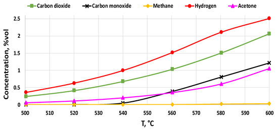 In order to quantify the contribution of the reaction in the absence of catalysts, a homogeneous reaction test was performed, with the same conditions adopted for the catalytic experiments (AcOH:H2O:Ar = 1:4:5), but with only quartz flakes within the reactor. Figure 4 shows that a maximum value of 20% was reached for AcOH conversion, descending, however, to zero at 500 °C and giving a low H2 yield and a considerable C3H6O yield. Moreover, analyzing the products distribution presented in Figure 5, one can appreciate the presence in the product streams of CO and CO2, while methane was not detected, thus suggesting that thermal decomposition and ketonization reactions were taking place, whilst the exothermic decarboxylation was suppressed. Furthermore, no decrease in the water concentration was detected at the reactor outlet (not reported in the graphs), leading to the conclusion that the water gas shift reaction was not occurring.