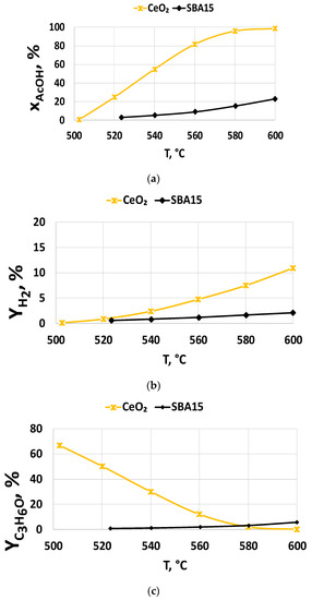 Carrying out the AcOH-SR with CeO2 or SBA-15, without the presence of the active phase, led to different results in terms of AcOH conversion, H2 yield and C3H6O yield, as depicted in Figure 6. The obtained data showed higher acetic acid conversions and H2 yields on ceria (100% AcOH and ~10% H2 yield at 600 °C) compared to SBA-15 (23% AcOH and ~2% H2 yield at 600 °C). However, the conversion dropped to zero at 500 °C, as in the case of the homogeneous reaction. Meanwhile, on SBA-15, around 530 °C the conversion dropped to zero, so the test was stopped before reaching the lowest value of the planned temperature.