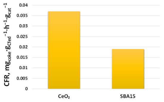 In addition, the support choice strongly affected the acetone selectivity of the sample, causing an opposite behavior in terms of acetone formation. While with SBA-15 only a slight concentration of acetone was detected, predominantly at higher temperatures, CeO2 selection resulted in the promotion of C3H6O formation, especially when the temperature decreased; although the ketonization mechanism is still widely debated in current literature, it has been proved the tendency of CeO2 to convert acetic acid in acetone [56,57]. Moreover, the carbon deposition results, shown in Figure 7 in terms of CFR, show the more pronounced tendency of CeO2 towards coke formation [17]. Earth metal oxides, compared to silica, are particularly prone to ketones formation, even without the presence of an active metal, due to their acid-base properties [58,59].