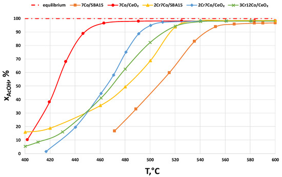 In Figure 8, a comparison in terms of XAcOH as a function of reaction temperature shows that, between the tested catalytic formulations, the best performances were achieved for 7Co/CeO2, that exhibited a conversion higher than 90% from 450 °C to 600 °C.