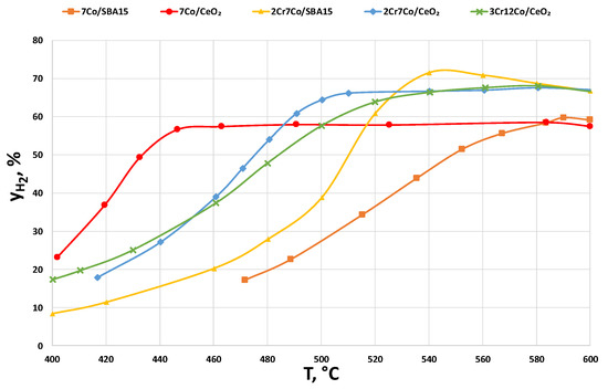 Even though the best performances in terms of AcOH conversions were obtained for the catalyst 7Co/CeO2, higher H2 yields were gained, as can be seen in Figure 9, above 500 °C, with the addition of chromium; a moderate increase in the H2 yield was observed for all the Cr containing samples. This phenomenon, observed for both the CeO2 and SBA-15 supported catalysts, may be due to the presence of smaller Co particles, obtained after the chromium addition (see Section 2.1), thus resulting in a better Co dispersion. However, below 480 °C, higher H2 yields are obtained for 7Co/CeO2 compared with the other catalytic formulations, thus suggesting that the Cr addition has only a slight effect in increasing AcOH-SR performances over the Co/CeO2 catalysts.