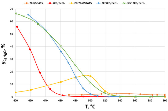 Comparison between the tested catalytic formulations in terms of C3H6O yield as a function of temperature.