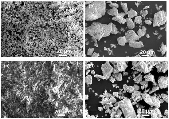 C-La2O3, CP-La2O2CO3, SG-La2O2CO3 and HT-La2O2CO3 were characterised using scanning electron microscopy (SEM) and analysed using ImageJ software in order to determine their morphology at the macro-scale (Figure 1). Each catalyst shows an irregular shape and particle size. CP-La2O2CO3 and HT-La2O2CO3 have larger particle sizes (typically 3–10 μm, Figure S1) when compared with C-La2O3 (~1 μm) and SG-La2O2CO3 (~3 μm). Additional analysis techniques are conducted to provide quantitative information to facilitate the establishment of structure-performance relationships. Brunauer–Emmett–Teller (BET) measurements of C-La2O3 determined a surface area of 13.6 m2/g, considerably lower than for CP-La2O2CO3 (60.7 m2/g), SG-La2O2CO3 (194.0 m2/g) and HT-La2O2CO3 (27.9 m2/g) (Table 1). The pore volume and the average pore diameter were determined from the desorption branch of the isotherm via the Barrett-Joyner-Halenda (BJH) method. CP-La2O2CO3 showed a larger pore volume (0.3 cm3·g−1) and average pore diameter (13.8 nm) in comparison to SG-La2O2CO3 and HT-La2O2CO3 (Table 1). This is likely to favour the diffusion of the reactants and products to and from the catalyst.