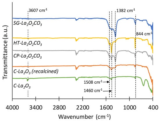 The solid catalysts were also characterised by using Fourier transform infrared (FTIR) spectroscopy as shown in Figure 3. The peak at 3607 cm−1 in the spectrum of C-La2O3 is indicative of the presence of bulk -OH functional groups, supporting the conclusion from XRD that La(OH)3 forms in the presence of atmospheric moisture. The peaks at 1508 and 1460 cm−1 show that the catalyst surface has reacted with CO2 and water to form chemisorbed carbonate and bicarbonates [38]. C-La2O3 is sensitive to atmospheric CO2. The peak at 844 cm−1 is ascribed to carbonate groups [36].