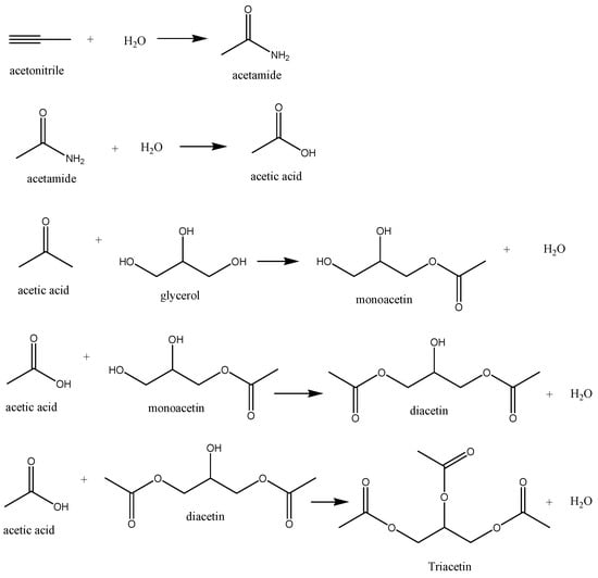 42. Silva, L.N.; Gonçalves, V.L.; Mota, C.J.A. Catalytic acetylation of glycerol with acetic anhydride. Catal. Commun. 2010, 11, 1036–1039. [Google Scholar] [CrossRef]