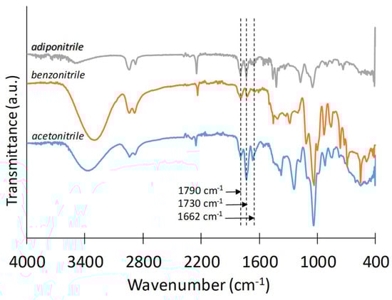 Figure 5. ATR-FTIR spectra from 4000–400 cm−1 of the liquid-phase resulting from the carboxylation of glycerol in the presence of different dehydrating agents: adiponitrile; benzonitrile; and acetonitrile. Reaction conditions: Reaction pressure = 45 bar, 6 wt.% C-La2O3 to glycerol ratio, 22.5 mmol glycerol, 45 mmol dehydrating agent, 18 h and reaction temperature = 160 °C.