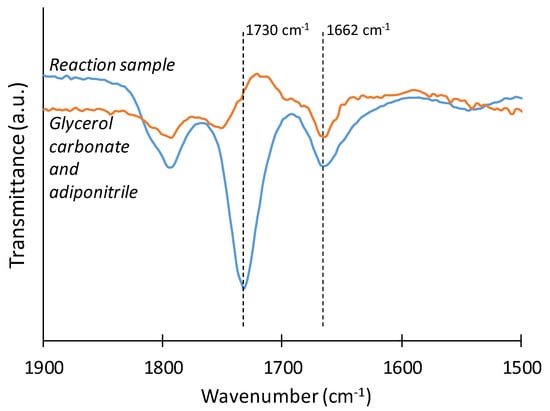Figure 6. ATR-FTIR spectra from 1900–1500 cm−1 of the liquid-phase resulting from: the reaction of glycerol, CO2 and adiponitrile; and the reaction of glycerol carbonate, CO2 and adiponitrile. Reaction conditions: Reaction pressure = 45 bar, 6 wt.% C-La2O3 to glycerol ratio, 22.5 mmol glycerol, 45 mmol adiponitrile, 18 h and reaction temperature = 160 °C.
