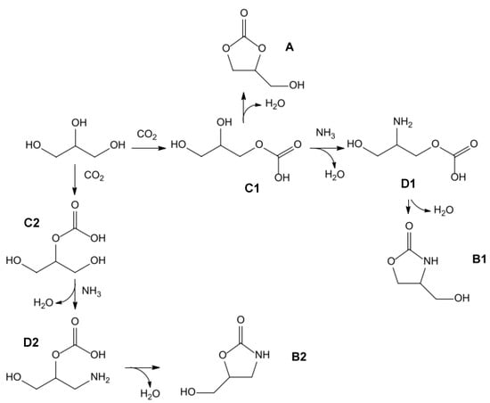Approximately 20 Mt of linear and cyclic carbonates are produced from the cycloaddition of CO2 and epoxides annually [8]. Glycerol carbonate can be manufactured from the reaction of glycerol with phosgene or via a transesterification reaction of acyclic organic carbonates (e.g., dimethyl or diethyl carbonate) [9]. These carbonates are commonly produced from phosgene. Phosgene is considered as toxic, environmental unfriendly and highly corrosive. The use of phosgene is therefore being eliminated and is banned in several countries [10]. Alternatively, glycerol carbonate can be synthesised from carbonylation of glycerol with urea [11,12,13]. This reaction has gained much interest among researchers because urea is available at a low-cost and this reaction can be carried out in the absence of a solvent; nevertheless, environmentally unfriendly by-products including isocyanic acid and biuret are produced and the elimination of ammonia during reaction is required [14,15,16].