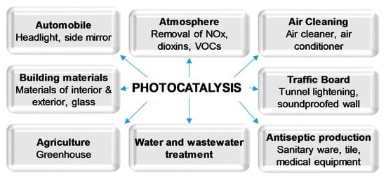 In recent decades, semiconductor photocatalysis has been proved to be an efficient approach for organic compounds decomposition and degradation. TiO2 has been widely and successfully used as a photocatalyst in many different areas (Figure 1) due to its advantages, such as low cost and good chemical stability. However, it requires employing relatively high photon energy to be activated. For this reason, many methods of narrowing of the band gap of TiO2 have been proposed, aimed at the direct usage of sunlight [7,8]. Amongst them, doping of TiO2 with non-metals such as carbon, nitrogen and sulfur is often reported as one of the most effective ways of increasing its photocatalytic activity under visible light [1,9,10]. Non-metal doping of TiO2 leads to changes in the electronic band structure, resulting in a smaller band gap energy value, and thus an improved response in the visible light [7,8,11].