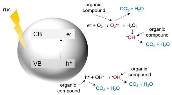 In heterogeneous photocatalysis, a reaction takes place on the surface of a photocatalyst. The general mechanism of photocatalytic decomposition of organic compounds is summarized in Figure 2.
