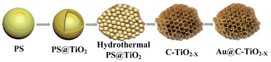 Qian et al. [101] presented the preparation procedure of TiO2-based photocatalysts with a honeycombed structure (Figure 3). A facile template method of synthesis involves the use of PS microspheres as a template. The TiO2 layer is formed on the surface of the template as a result of the hydrolysis process. Subsequently, calcination is applied in order to remove the template and obtain a honeycombed morphology. During the calcination, an incomplete combustion of the PS results in the formation of carbon-doped TiO2. There is a possibility of further processing of the as-received photocatalyst, for instance by depositing of Au onto C-doped TiO2 layer.
