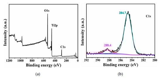 XPS spectra of C-doped TiO2: (a) full scan; (b) focus scan of C 1s. Reproduced from [103] with permission.