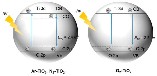 Figure 5 presents a comparison of the pathways of electron transfer in the C-doped TiO2 annealed under inert (Ar, N2) and oxidizing (O2) atmosphere. In both cases, the formation of a new state above the VB can be observed, which was attributed to the C 2p state of the interstitial carbon. Moreover, in the case of the photocatalysts annealed in the inert environment, a formation of an additional state below the CB was postulated, which was ascribed to the antibonding C-O state resulting from the creation of Ov. The C-O state was not observed in the case of calcination in oxygen flow because such conditions diminished the Ov [108].