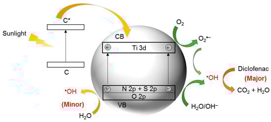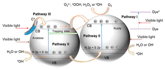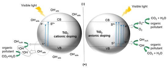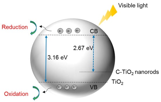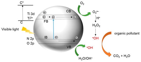 Shao et al. [109] proposed a possible mechanism of the enhanced photocatalytic activity of C-doped TiO2 nanorods (Figure 6). The appearance of a new impurity energy level above the VB, caused by C-doping of TiO2, results in narrowing of the band gap, and the photocatalyst can absorb the visible light. Direct promotion of electrons from the impurity level to the CB leads to the production of photogenerated electron–hole pairs. Electrons participate in the reduction of O2 molecules to form O2•−, while holes oxidize hydroxyl ions and water molecules to •OH radicals.