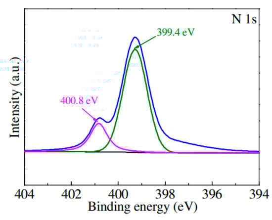 There are two possible modes of nitrogen incorporation into the TiO2 structure, interstitial (addition of nitrogen into the TiO2 lattice) and substitutional (replacement of oxygen) [112,195]. To show the state of nitrogen, XPS analysis is performed. In the literature, the peak around 400 eV is widely assigned to the interstitial nitrogen species, directly bound to the lattice oxygen (Ti-O-N) [164,195]. According to Marques et al. [134] and Mahy et al. [165], the photoelectron lines associated with Ti-N bonds inherent to a successful substitutional doping appear in the 396–398 eV range, while lines above 400 eV are usually assigned to the interstitially doped nitrogen. Cao et al. [196] confirmed the presence of the peak at 399.4 eV, implying substitutional nitrogen doping (O-Ti-N) and the other peak at 400.8 eV, which can be assigned to the interstitial nitrogen doping (Ti-O-N) (Figure 7). It has been reported that the interstitial N atoms give rise to the higher energy states in the band gap and behave as stronger hole trapping sites, reducing the direct oxidation ability. They are also easily oxidized in air at high temperatures [193].