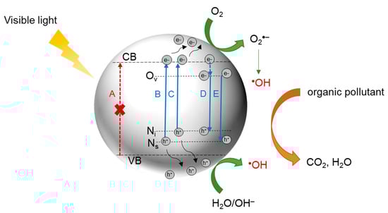 The mechanism of photocatalysis in the presence of N-doped TiO2 is summarized in Figure 8. The substitutional nitrogen state (Ns) and the interstitial nitrogen state (Ni) are directly responsible for the origin of the visible light induced photocatalysis. Nitrogen doping allows the electron to be excited from the N impurity levels (Ns and Ni) to the CB of TiO2 (paths B and C). Then the electron can be trapped by the oxygen vacancy, which is an energetically favorable process. The electrons in the CB and Ov states may recombine with h+ in the N impurity levels, which is an unfavorable phenomenon. Alternatively, the photoexcited e− can reduce O2 molecules to O2•−, resulting further in the formation of •OH. Hydroxyl radicals can be also generated upon reaction of the holes with H2O or OH−. Pathway A, representing direct excitation of electrons from VB to CB of TiO2, is not possible under visible light irradiation [17,199].