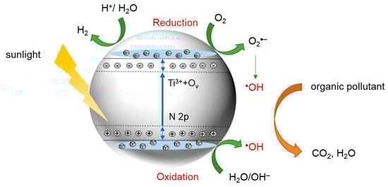 Schematic illustration for the solar-driven photocatalytic mechanism of N-doped TiO2 (adapted from [196]).