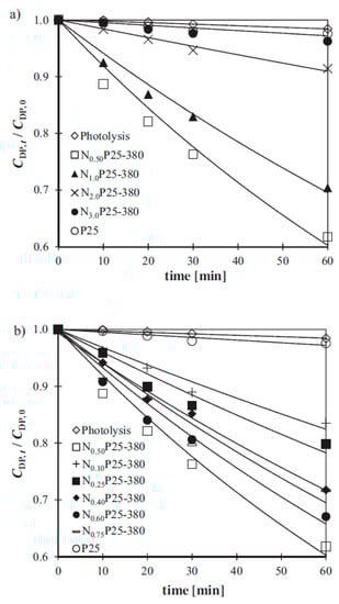 Photocatalytic degradation of DP (10 mg L−1) under visible light illumination for TiO2 P25 modified with different urea contents. Photocatalyst loading = 1.0 g L−1. The curves represent the fitting of the pseudo-first order equation to the experimental data. Reproduced from [209] with permission from Elsevier.