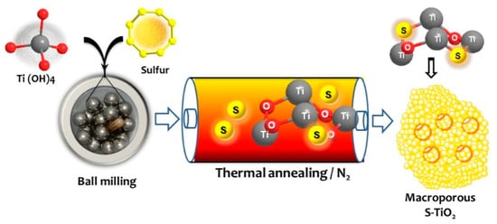 Moreover, newer synthetic strategies have also been proposed. Pillai et al. [267] used continuous ball milling with moderate thermoannealing (Figure 11), which resulted in a unique S-doped TiO2 nanostructure composed of macroporous channels with mesoporous cores. This environmentally friendly, solventless and template-free method requires titanium hydroxide and elemental sulfur as substrates.