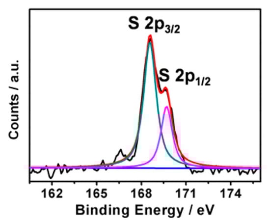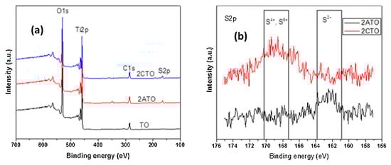 There are two possible routes of sulfur doping-cationic or anionic. It has been reported that cationic doping takes place by titanium substitution with S4+ or S6+, while anionic doping occurs by oxygen substitution with S2− [272]. The chemical state of the doped sulfur can be investigated by the XPS analysis (Figure 12). Generally, a peak at the BE values above 168 eV in the S 2p spectra can be assigned to sulfur on the higher oxidation state (S4+, S6+), substituting Ti atoms in the lattice of TiO2 [236,260]. The peaks around 160–163 eV can indicate the Ti-S bonds’ formation due to the substitution of O atoms in the TiO2 lattice by S2− [236,246,251,273].