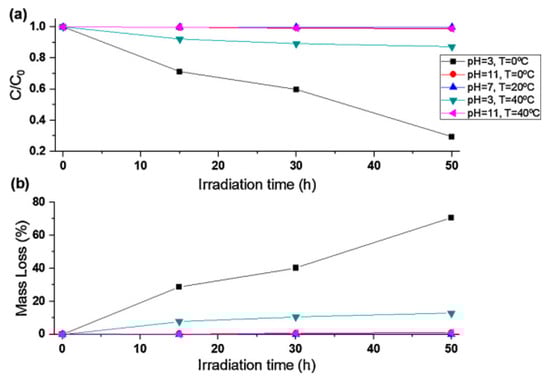 The effectiveness of the photodegradation of pollutants on the semiconductor surface is influenced by: (i) the chemical composition, structure and concentration of pollutants, (ii) the radiation intensity, (iii) the exposure time, (iv) the amount of photocatalyst used, (v) the oxygen content in the reaction medium, (vi) the pH value of the solution, (vii) the properties of a photocatalyst (specific surface area, crystallographic structure, number of surface defects, presence of additives and dopants, etc.) [45,46].