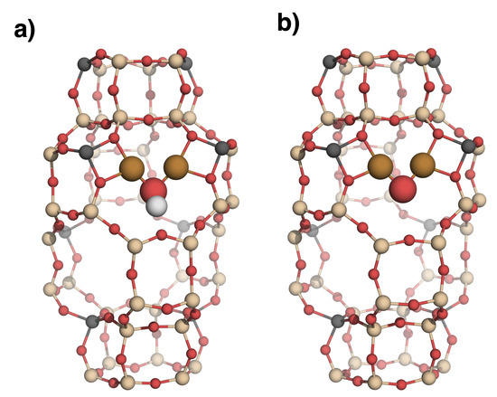It has been shown that the active site motif is dynamic and depends sensitively on the operating conditions, such as the temperature and partial pressure of relevant gases [26,27]. Previous work [27] reports that for a quasi-catalytic reaction cycle in the zeolite Cu-SSZ-13 (with Si:Al = 10:2 and Al:Cu = 2:2, in the 12 T-site unit cell), the CuOH motif, as seen in Figure 1a, is the energetically preferred structure for low temperature and low partial pressure of oxygen, while for high temperature and high partial pressure of oxygen, the CuO motif, as can be seen in Figure 1b, is preferred. However, the reaction mechanism and character of the intermediates are not yet known.