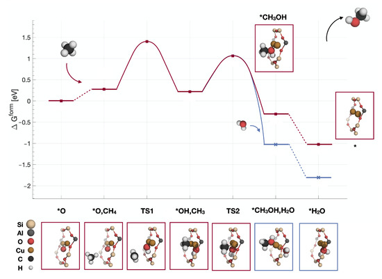 The complete reaction under dry conditions, as marked by red squares in Figure 2, is exergonic by −1.02 eV. If water is added to the reaction mechanism after TS2, the methanol desorption becomes exergonic by −1.81 eV. This confirms the need for a solvent during the extraction phase [9,30]. The most exergonic reaction pathway ends in a Z[CuHO] structure with a Cu–Cu distance of 2.43 Å, Cu–O distances of 1.96/1.97 Å and a Cu–O–Cu angle of 76.3. This is stretched and more acute as compared to the Z[CuO] structure of the original active site, where the distances are 2.39 Å and 1.74/1.74 Å and the angle 86, respectively. In the energetic landscape, the relative energies of the reaction path show a decrease in energy when water is added (see Figure S2).