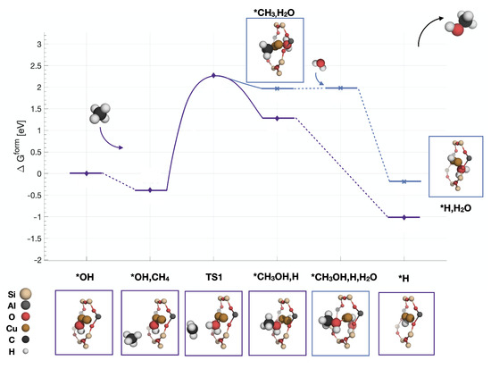 There is an additional path to the direct formation of CHOH on the Z[CuOH] structure. After the methyl TS1, an intermediate with a 0.18 eV lower formation energy than the direct formation of methanol, *CHOH,H, is found (see Figure S5).This is a CH–Cu–HO structure with a 0.69 eV higher free energy of formation (blue cross in Figure 3). To form methanol via this intermediate, water is included in the reaction, and the subsequent CHOH formation occurs at no cost. The CHOH molecule is attached to the Cu–H–Cu cluster on one side at a distance of 1.99 Å, and the HO molecule is on the other side at a distance of 2.08 Å. The most exergonic final state is that of Z[CuH] for completely dry conditions, i.e., including no water molecules. When water is included, the final state is a Z[CuH(HO)] structure with Cu–H bond of 1.59 and 1.58 Å and Cu–HO bonds of 2.17 and 2.14 Å, 0.83 eV higher in energy. The inclusion of water in the mechanism binds methanol stronger to the framework, hindering the desorption of the products. This is undesired and in contrast to established experimental procedure, where a solvent is introduced in order to extract the produced methanol [31]. Since the zeolite contains water [26,27], our results indicate that the participation of the Z[CuOH] site in the reaction is limited. In the energy landscape, the relative energies of the reaction path show a decrease in energy when water is added; see Figure S5.