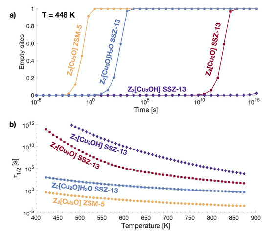 Coverages calculated for the reaction over four different sites: Z[CuO] in ZSM-5, Z[CuO]HO in SSZ-13, Z[CuO] in SSZ-13 and Z[CuOH] in SSZ-13. (a) shows transient kinetics and the fraction of empty sits as a function of time at a fixed temperature of 523 K. In (b), the half-time of the sites as a function of temperature is shown.