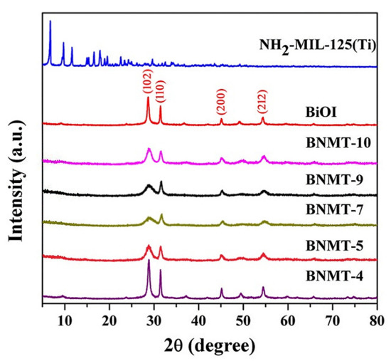 In order to explore the features of the samples, we have carried out the following characterization methods. Figure 1 showed the comparison for the XRD patterns of BiOI, NH2-MIL-125(Ti), and BiOI/NH2-MIL-125(Ti) composites with different molar ratios. The pristine BiOI showed orthorhombic phase (JCPDS No.10-0445) with well indexed (102), (110), (200), and (212) crystal planes, and the 2θ values of the four main characteristic peaks were located at 29.7˚, 31.7˚, 45.4˚, and 55.2˚, corresponding to (102), (110), (200), and (212) crystal planes of BiOI, respectively. The four peaks were sharp with high intensity, and no characteristic peaks of other substances appeared, suggesting that the crystallinity of BiOI was good, and there were no formation of by-product and change of crystal form. NH2-MIL-125(Ti) had obvious diffraction peaks at 6.8˚, 9.7˚, 11.6˚, 15.2˚, and 19.5˚, which were consistent with the MIL-125(Ti) characteristic peaks. The results showed that the presence of amino groups had no obvious effect on the structure of NH2-MIL-125(Ti) [22]. There were four obvious characteristic diffraction peaks of BiOI in the BiOI/NH2-MIL-125(Ti) complex, but there was no characteristic diffraction peak of NH2-MIL-125(Ti), which may be due to the low composition and high dispersion of NH2-MIL-125(Ti) in BiOI/NH2-MIL-125(Ti). This phenomenon has been reported in other systems [23].