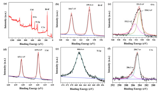 The surface chemical composition and elemental valence state of BiOI/NH2-MIL-125(Ti) were investigated by XPS measurement. The survey spectrum of BNMT-9 in Figure 2a confirmed the existence of Bi, O, I, Ti, and C in the BNMT-9 sample. Figure 2b presented Bi 4f spectrum whereby two peaks at binding energy of 164.70 eV and 159.40 eV were the split signals of Bi 4f5/2 and Bi 4f7/2, accordingly. The binding energy gap was 5.30 eV, which confirmed that Bi in the BNMT-9 was Bi3+ [24]. In Figure 2c, the O1s peak could be fitted into three peaks, which were bound up with the crystal lattice O atoms (532.3 eV), oxygen in Bi–O bond (531.5 eV), and oxygen in the titanium-oxo cluster (530.3 eV) [25]. Figure 2d showed the spectra of I 3d. The peaks located at 631.1 and 619.4 eV were assigned to I 3d3/2 and I 3d5/2 respectively. In Figure 2e, Ti 2p orbit binged to light the splitting peaks at 466.6 and 465.9 eV that lay in line with Ti 2p3/2 and Ti 2p1/2, accordingly, and this result showed the existence of Ti3+ in BNMT-9 [26]. The C 1s showed two splitting peaks at 286.3 and 284.7 eV (Figure 2f) corresponding to C=C and C–C, respectively. The above results showed that BiOI/NH2-MIL-125(Ti) was successfully prepared.