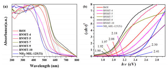 The optical properties of the as-synthesized BiOI, NH2-MIL-125(Ti) and BiOI/NH2-MIL-125(Ti) composites were investigated by UV–visible diffuse reflectance spectroscopy (UV–vis). Figure 5a showed that the visible light absorption edges of all samples were in the visible range. The NH2-MIL-125(Ti) had visible light response due to the introduction of amino groups [29]. The absorption edge was about 520 nm, and the band gap value was 2.41 eV. The semiconductor BiOI had a strong visible light response with an absorption edge of about 610 nm and a band gap value of 2.08 eV. With the increase of NH2-MIL-125(Ti) recombination, the visible light response range of the composites increased first and then decreased, in which the BNMT-9 absorption range was the largest, and its absorption edge was about 660 nm. The band gaps (Eg) can be evaluated from Tauc’s plots. It could be found from Figure 5b that the band gap energy (Eg) of different samples was measured by extrapolation of the linear part of the curves calculated by plotting (αhν)2 versus hν. Accordingly, the Eg of BiOI, NH2-MIL-125(Ti), BNMT-4, BNMT-5, BNMT-7, BNMT-9, and BNMT-10 were estimated to be 2.08, 2.41, 2.18, 1.97, 1.92, 1.90, and 2.30 eV, respectively. The response range of BNMT-4 and BNMT-10 were smaller than that of BiOI but a little higher than that of BiOI/NH2-MIL-125(Ti). That meant the introduction of NH2-MIL-125(Ti) can expand the visible light response range of BiOI/NH2-MIL-125(Ti) and improve the visible light utilization ratio.