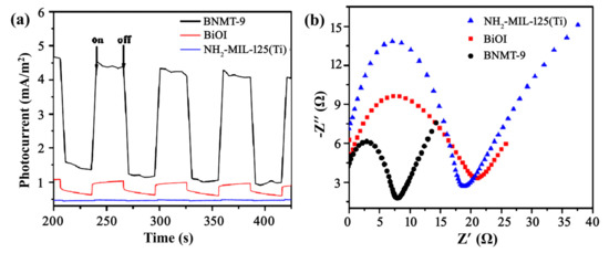 (a) Photocurrent responses of BNMT-9, BiOI, and NH2-MIL-125(Ti), and (b) Impedance diagrams of BNMT-9, BiOI, and NH2-MIL-125(Ti).